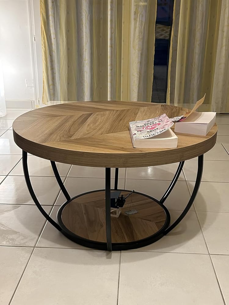 Table basse ronde en bois et métal avec double plateau, design élégant et pratique pour un salon moderne.
