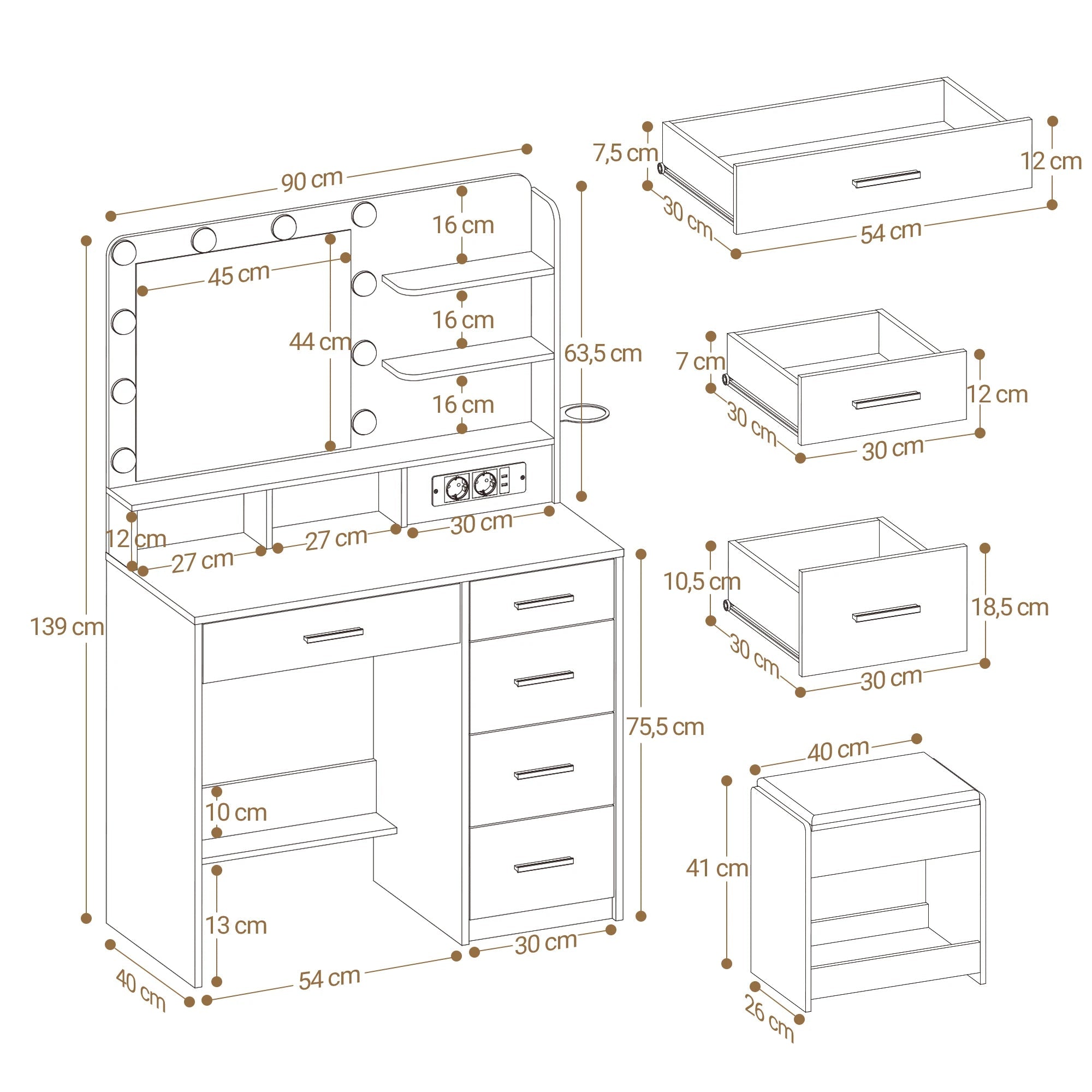 Coiffeuse blanche avec miroir LED réglable, 5 tiroirs, niches ouvertes, tabouret avec rangement et chargeur intégré. Élégance, confort et technologie réunis.