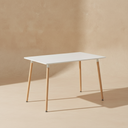Table à manger au design minimaliste avec plateau blanc et pieds bois clair, idéale pour une salle à manger contemporaine et élégante.able à manger blanche au design nordique, alliant simplicité et élégance. Son plateau épuré et ses pieds en bois clair apportent une touche lumineuse et moderne, idéale pour les repas quotidiens dans un intérieur chaleureux et raffiné.