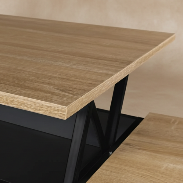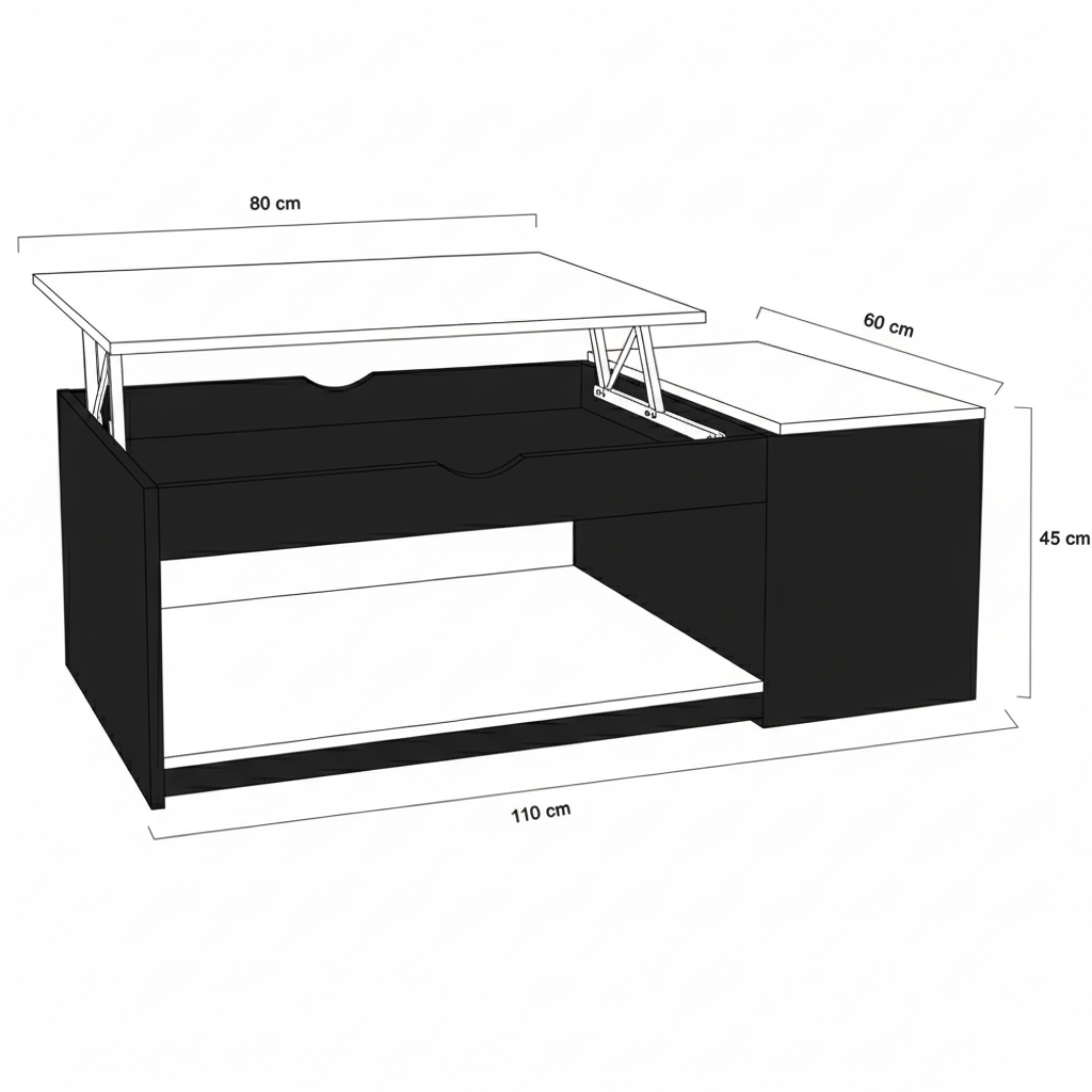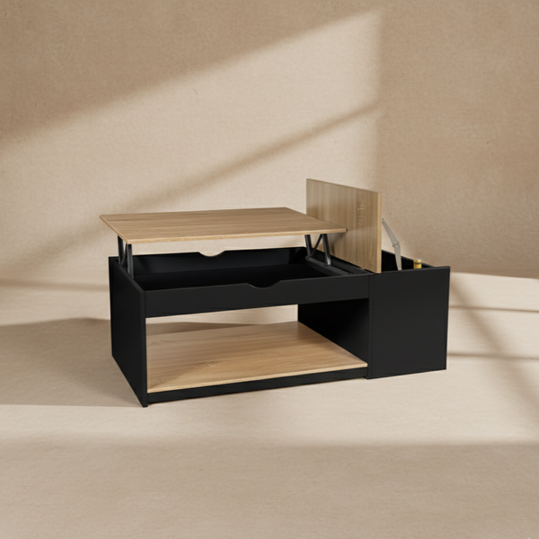 Une table basse relevable mêlant noir élégant et plateau bois effet hêtre, avec rangements intégrés et design moderne, parfaite pour un salon raffiné et fonctionnel.