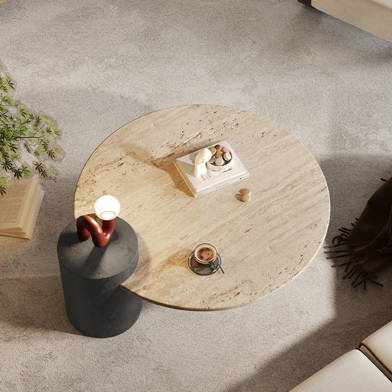 Table basse ronde en travertin et bois massif au design minimaliste, parfaite pour un salon raffiné et contemporain.