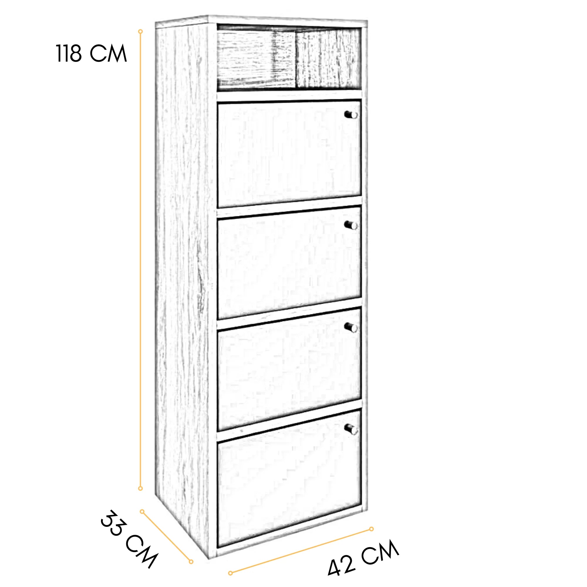 Moderner Schuhschrank aus schwarzer Eiche mit vier Klapptüren und offenem Fach, platzsparendes vertikales Design, hochwertige Verarbeitung, ideal für einen eleganten und perfekt organisierten Eingangsbereich.