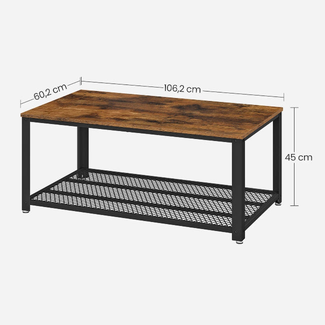 Table basse design en bois et métal, avec deux niveaux pratiques et pieds réglables pour une stabilité parfaite, même sur sols irréguliers.