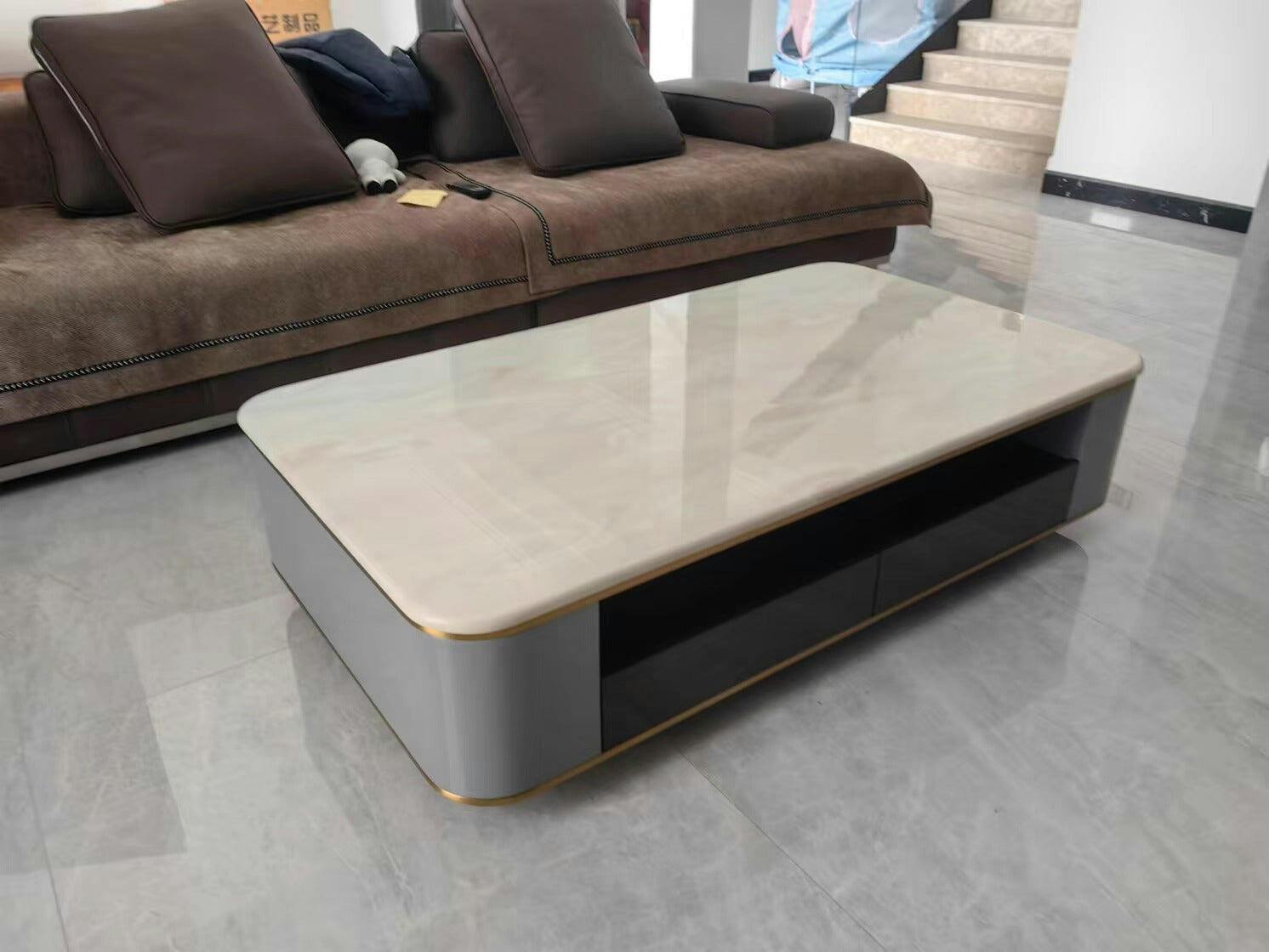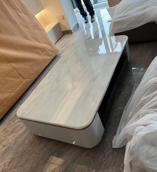 Table basse en marbre au design luxueux avec rangements intégrés, idéale pour un salon moderne et raffiné.